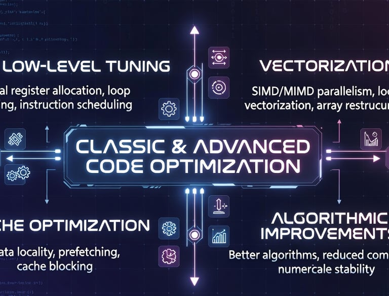 Deep low-level tuning including vectorization (AVX-512, SVE), loop transformations, cache optimization, NUMA-aware data placement, kernel rewriting, and algorithmic improvements — routinely delivering 10× to 100× speedups on critical sections.